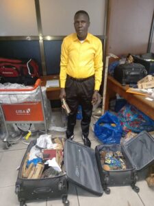 Les services des douanes gabonaises ont intercepté, à l’aéroport international de Libreville, des passagers béninois transportant des valises remplies d’objets inhabituels, décrits par plusieurs sources comme des « fétiches ». Les photographies de l’arrestation, largement relayées sur les réseaux sociaux, montrent les hommes et les contenus de leurs bagages, dont la nature exacte et la finalité n’ont, pour l’heure, pas été officiellement clarifiées par les autorités.